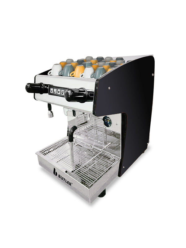Butler (Model Roma 1) is a single-group, traditional espresso coffee machine built with Italian-inspired design, featuring semi-automatic or automatic dosing with 4 selection buttons, thermo-siphonic heating, automatic boiler level control, and dual gauges for water and steam pressure for precise brewing and steaming. It has a 4.0 litre boiler, runs on 1.85 kW at 220–240 V/50 Hz and making it well-suited for smaller cafés and moderate coffee demand.