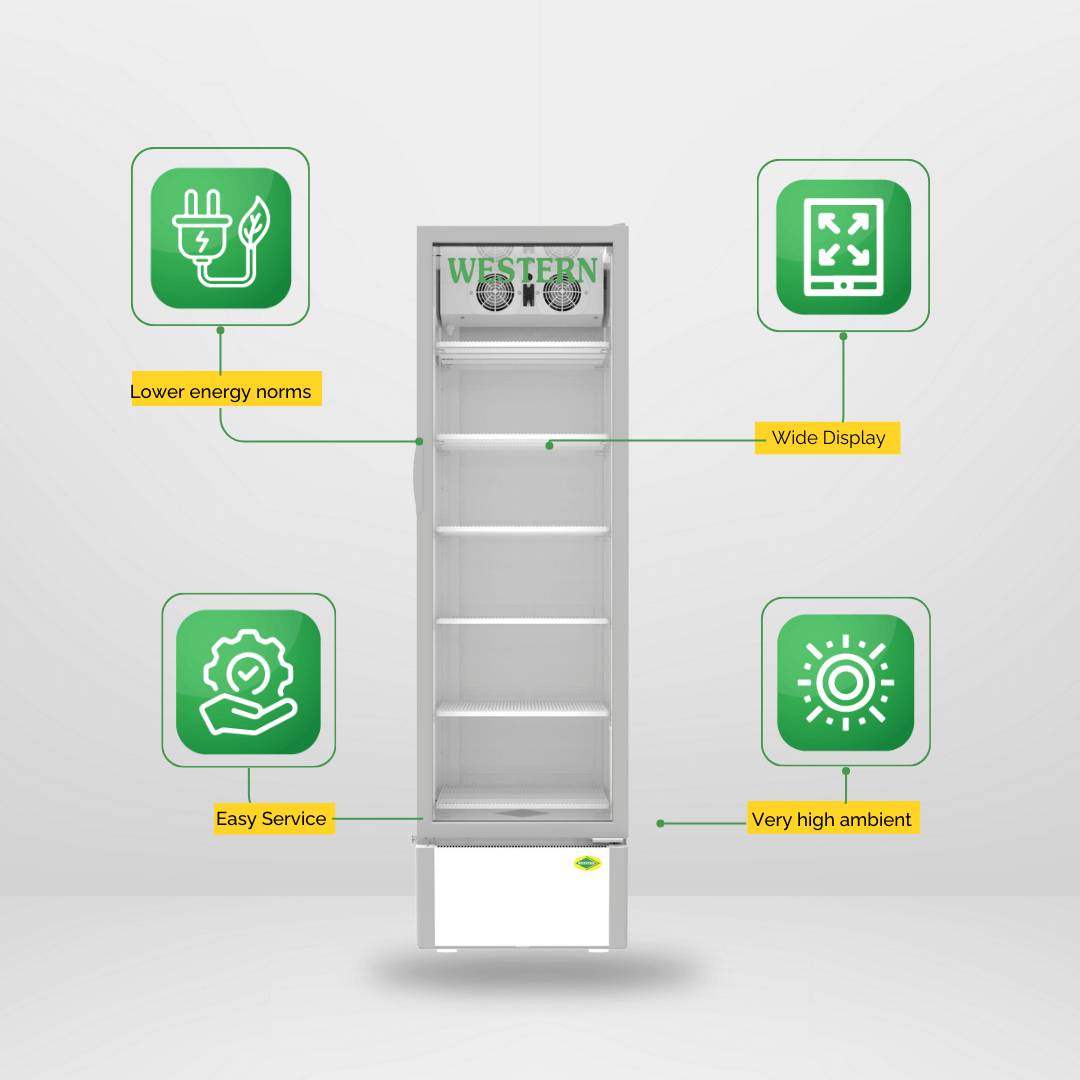 The Western SRC501HC-GL is a larger single‑door commercial refrigerator offering a gross volume of about 405 litres, providing more space for chilled goods. It comes with multiple adjustable shelves and a transparent glass door to display products clearly while maintaining a cooling range that keeps drinks and perishables fresh. Designed for retail environments like supermarkets and beverage outlets, this model combines effective temperature control with a practical layout to organize bottles, cans, and other items efficiently.